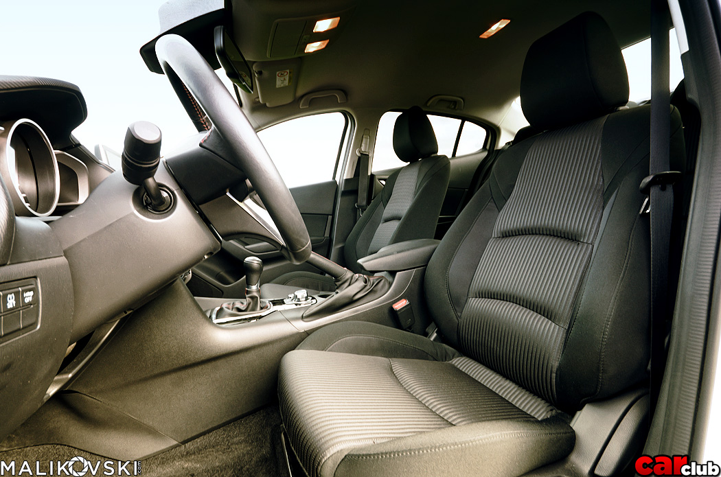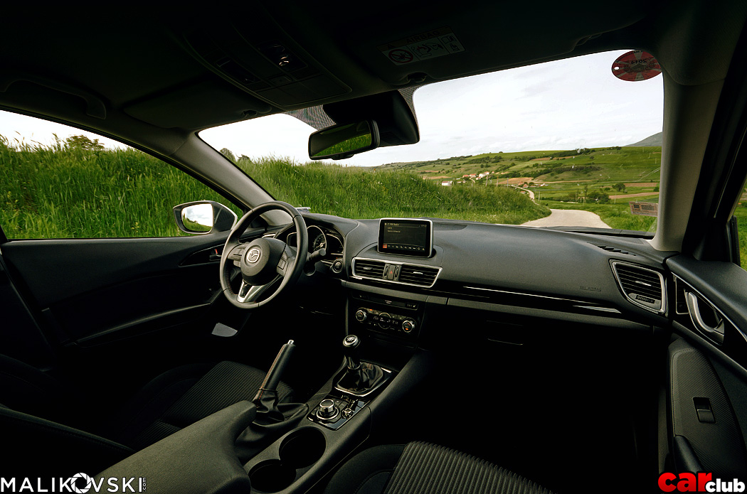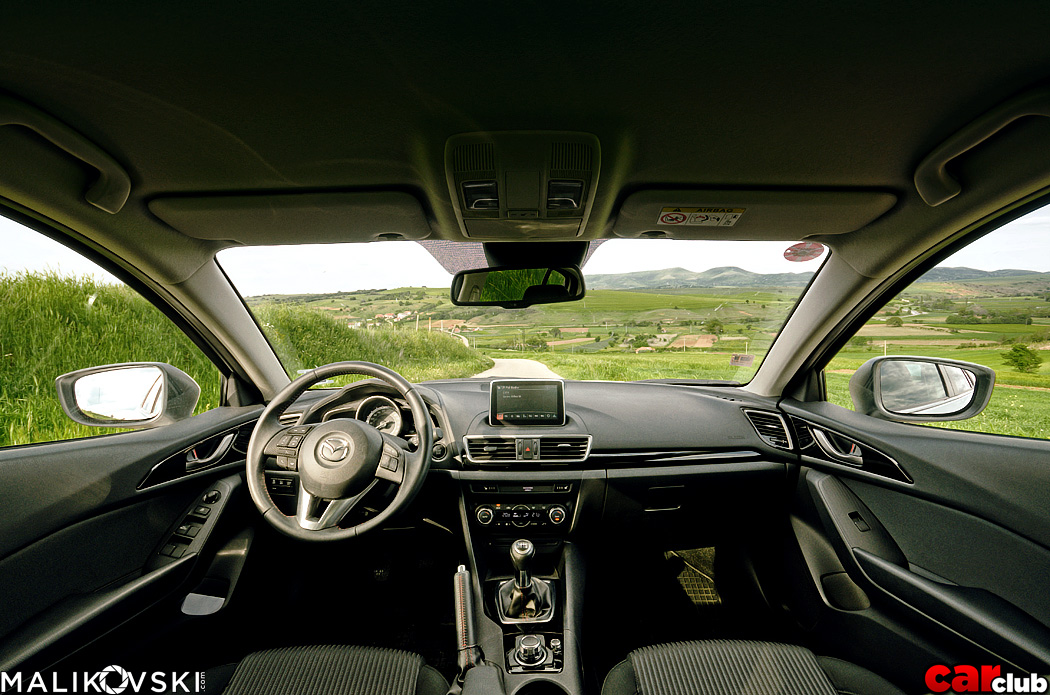 Штом ќе ја отворите возачката врата, ќе ве пречека ентериер за кој не само што се користени квалитетни материјали, туку е и со одлично погодена ергономија. Лесно се наоѓа комфорна возачка позиција зад управувачот, а сите контроли се јасни и логично поставени. Прегледноста е задоволителна а маневрирањето во тесни простори го олеснува паркинг камерата која е дел од Revolution нивото на опрема. Секако, мораме да го истакнеме и одличниот мултимедијален уред кој доаѓа и со уред за навигација. Кога станува збор за просторноста во ентериерот – Mazda 3 Sedan е во самата средина на класата. Има автомобили кои имаат помалку простор, но има и конкуренти кои нудат повеќе простор. Сепак, просторот внатре не е за потценување – Mazda 3 без никаков проблем ги исполни сите барања кои ние ги поставивме пред неа.