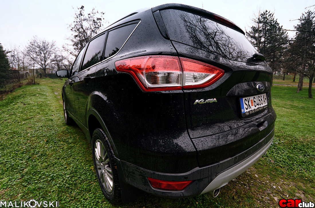 Сепак, предниот дел е логичен раст на она што го знаеме од кај Focus и Fiesta, со големи отвори за воздух и генерално привлечни пропорции. Всушност – истата приказна се проткајува околу целиот автомобил – можеме да кажеме дека се работи за малку конзервативен облик, но со модерни и привлечни детали кои му даваат свеж лик на автомобилот. Благодарение на малку традиционалната форма Kuga може да понуди многу простор, додека растечката линија на прозорците визуелно ја намалува висината, а задниот дел го комплетираат двојните завршетоци на издувниот систем кои суптилно го нагласуваат спортскиот и авантуристички дух на автомобилот.