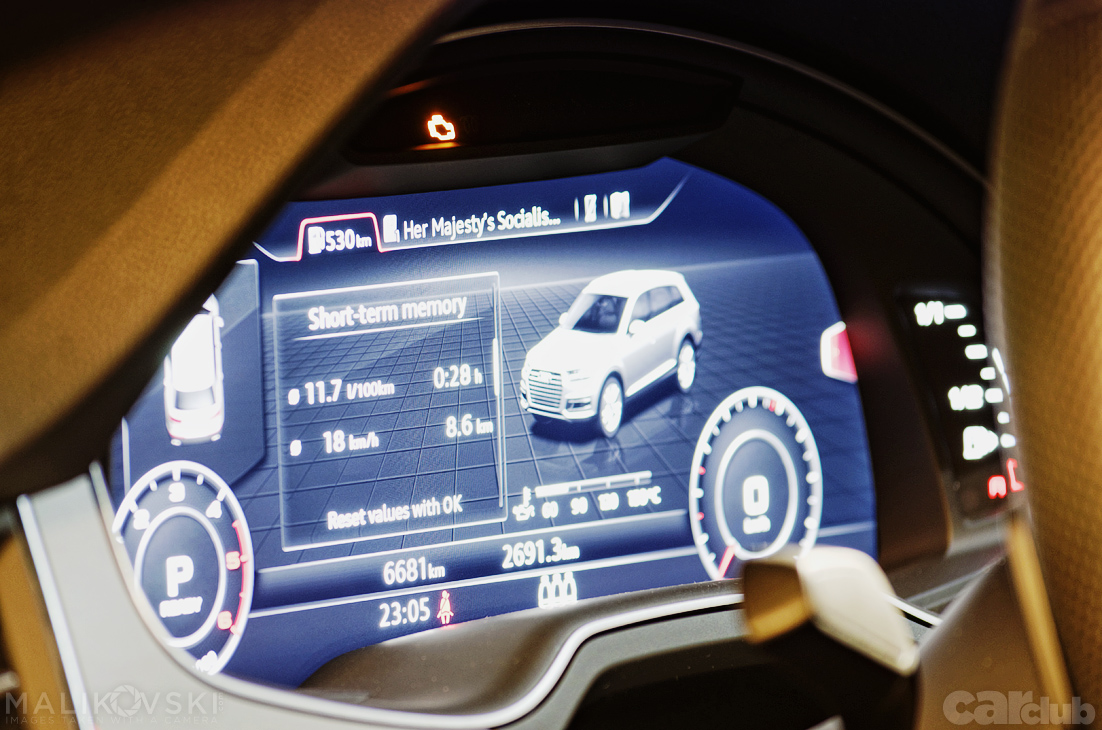 Возењето низ град со Audi Q7 е полесно од она што очекувате – заради формата на автомобилот, високата седечка позиција, но и големите стаклени површини – прегледноста е одлична и лесно се препознаваат „границите“ на големиот SUV, па и релативно е лесно да се движите низ градскиот метеж. Маневрабилноста е задоволителна, а паркирањето е олеснето благодарение на сензорите за паркирање и паркинг-камерата. Ние го возевме Q7 неколу дена низ градскиот метеж, како и надвор од улиците – и измеривме просечна градска потрошувачка од 10.5 литри на 100 километри, која во одредени услови се симна и под 10 литри на 100 километри – одлични резултати за волку големо возило!