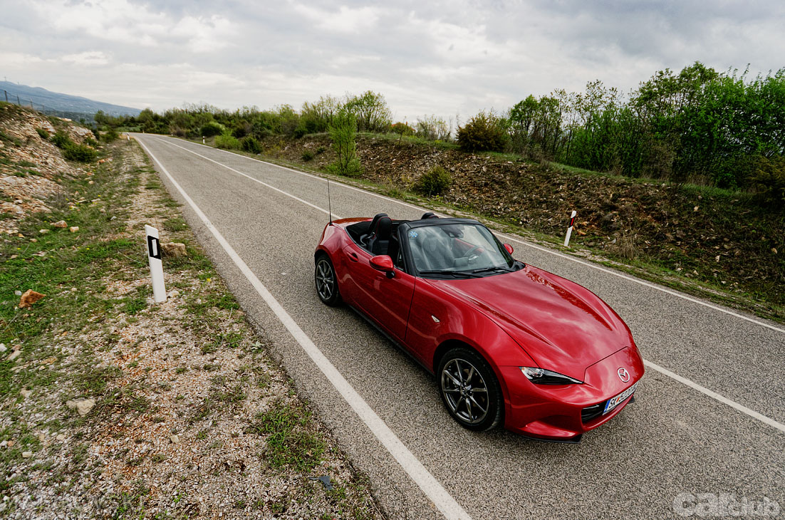 Во ред, време е да се упатам надвор од урбаните средини и навистина да ги дознаам квалитетите на MX-5. Дволитарскиот атмосферец реагира и звучи одлично, а бидејќи автомобилот тежи само еден тон, перформансите се одлични. Во време на сè поприсутно турбополнење забораваме на инстантноста и убавината на убаво-навиени атмосферски бензинци. На располагање се 160 коњски сили при 6000 вртежи во минута и 200 Nm вртежен момент достапни од 4600 вртежи во минута.