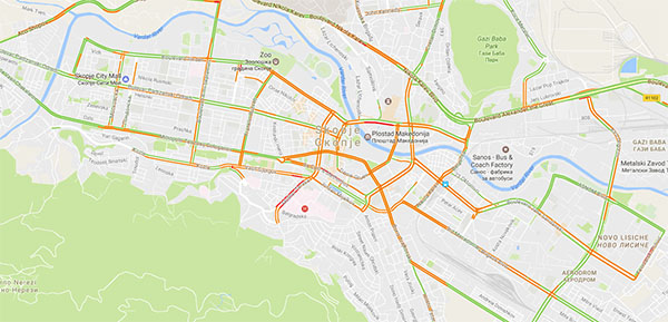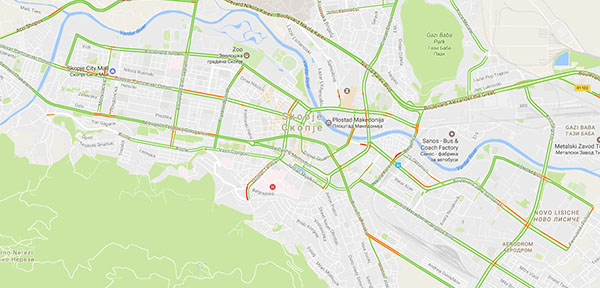 Google Maps апликацијата за мобилни уреди (но истото можете да го направите и на обичен компјутер, како и на таблет) ви овозможува во реално време да го следите интензитетот на сообраќајот во Скопје и да идентификувате места кои се „заглавени“ за да можете полесно да стигнете до вашата дестинација. Секако, ова не е нова технологија, и во многу земји веќе одамна се користи, но сепак е интересно да се разгледа како тоа изгледа и кај нас.