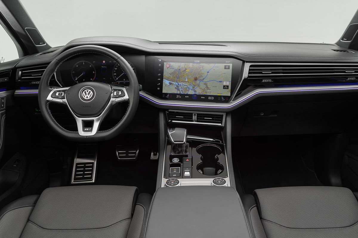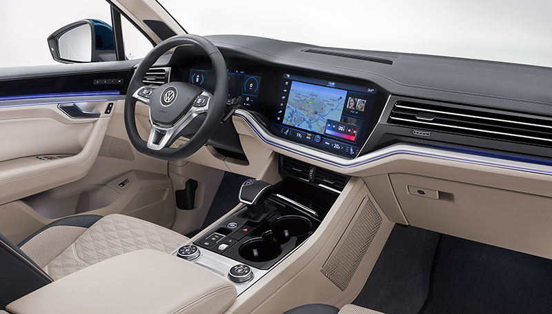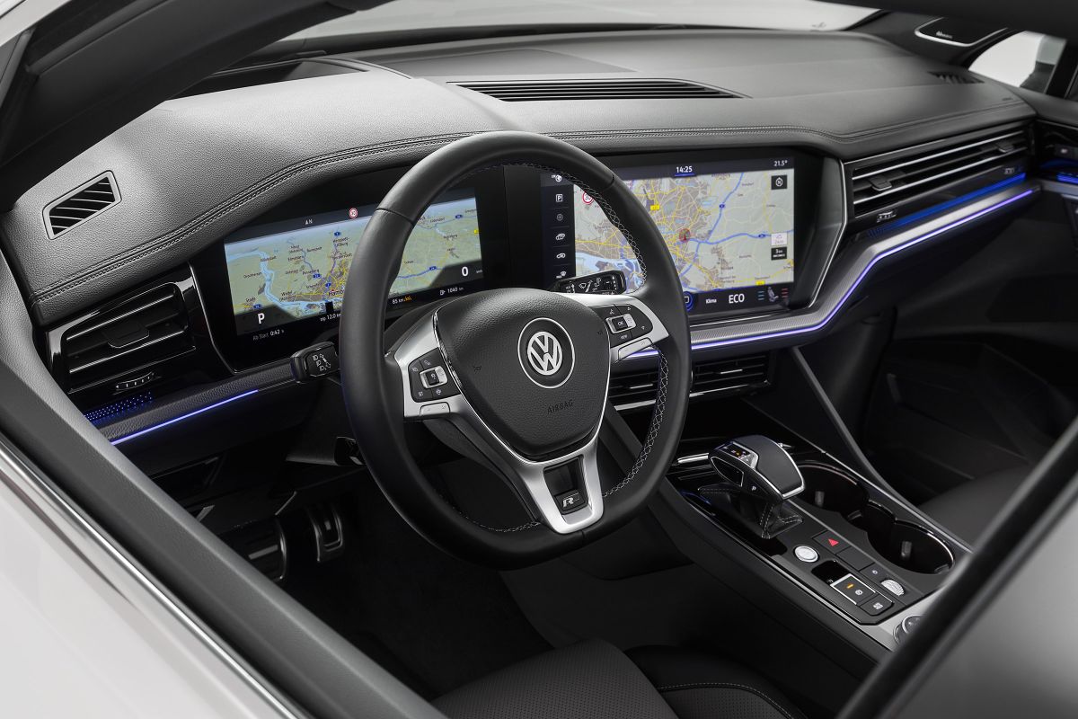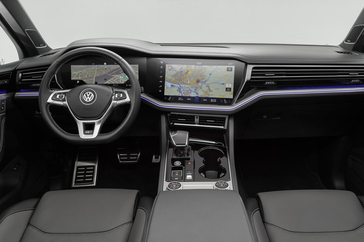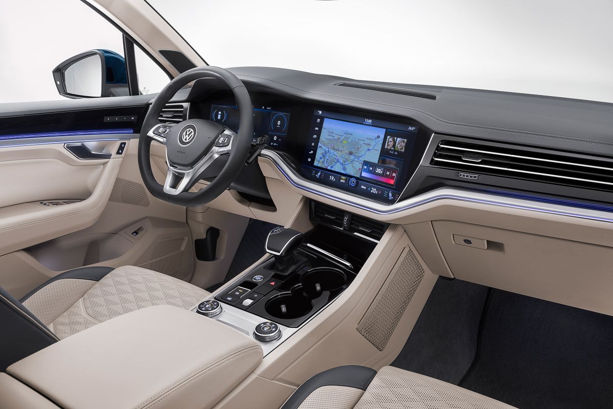 Кабината на Touareg ги добива сите нови технологии на Volkswagen – но има и неколку новитети. Најважна е Innovision Cockpit извведбата на двата огромни екрани кои функционираат како еден. Ќе забележите дека има многу малку физички прекинувачи – и навистина изгледа интересно поврзувањето меѓу 12-инчниот панел пред возачот со 15-инчниот дисплеј поставен на централната конзола.