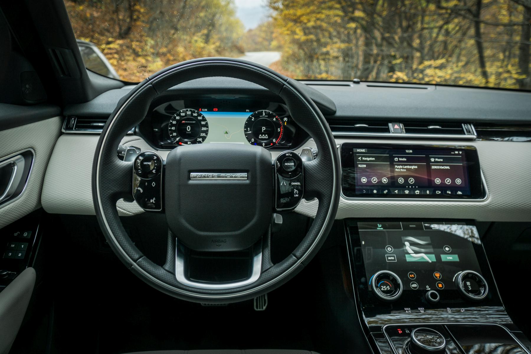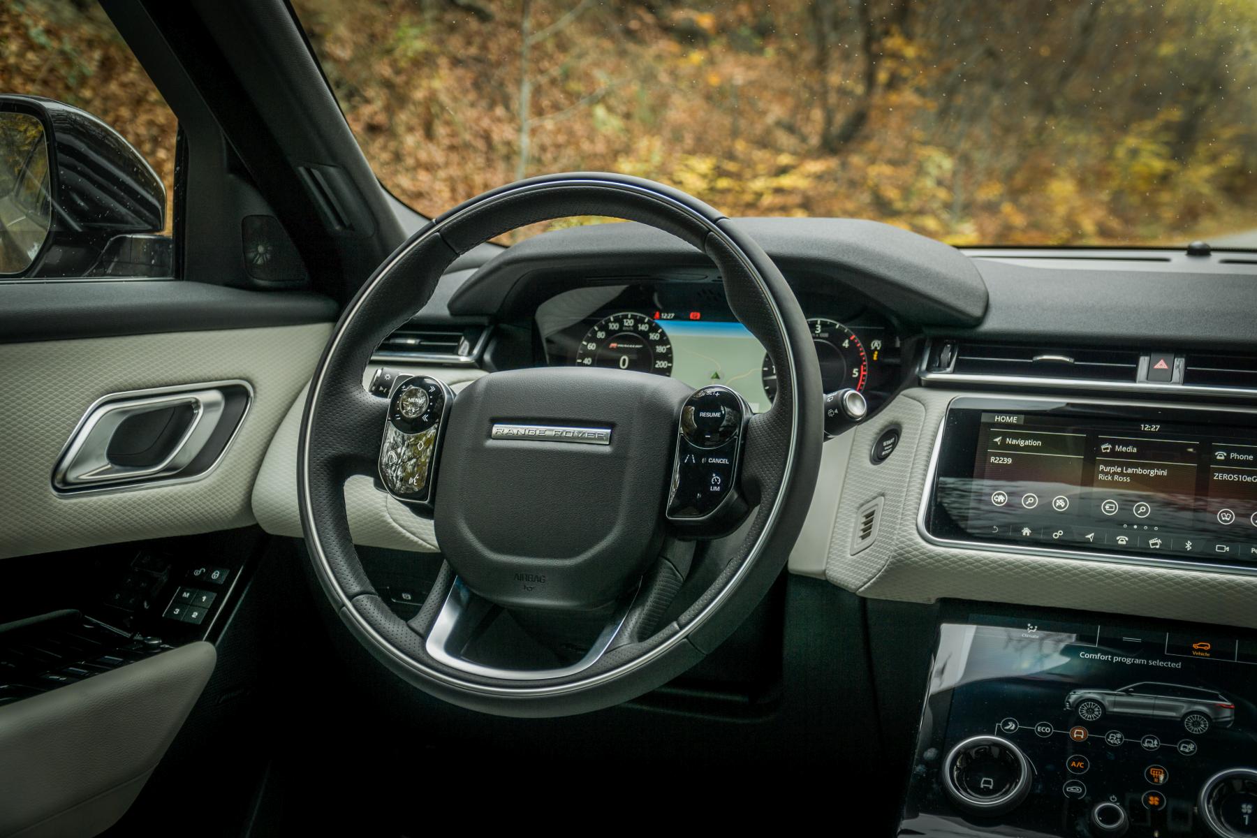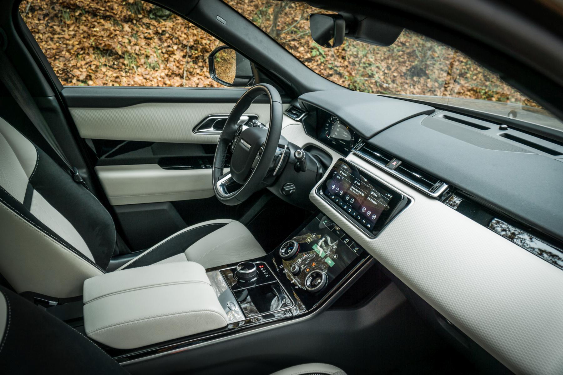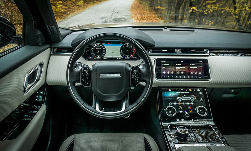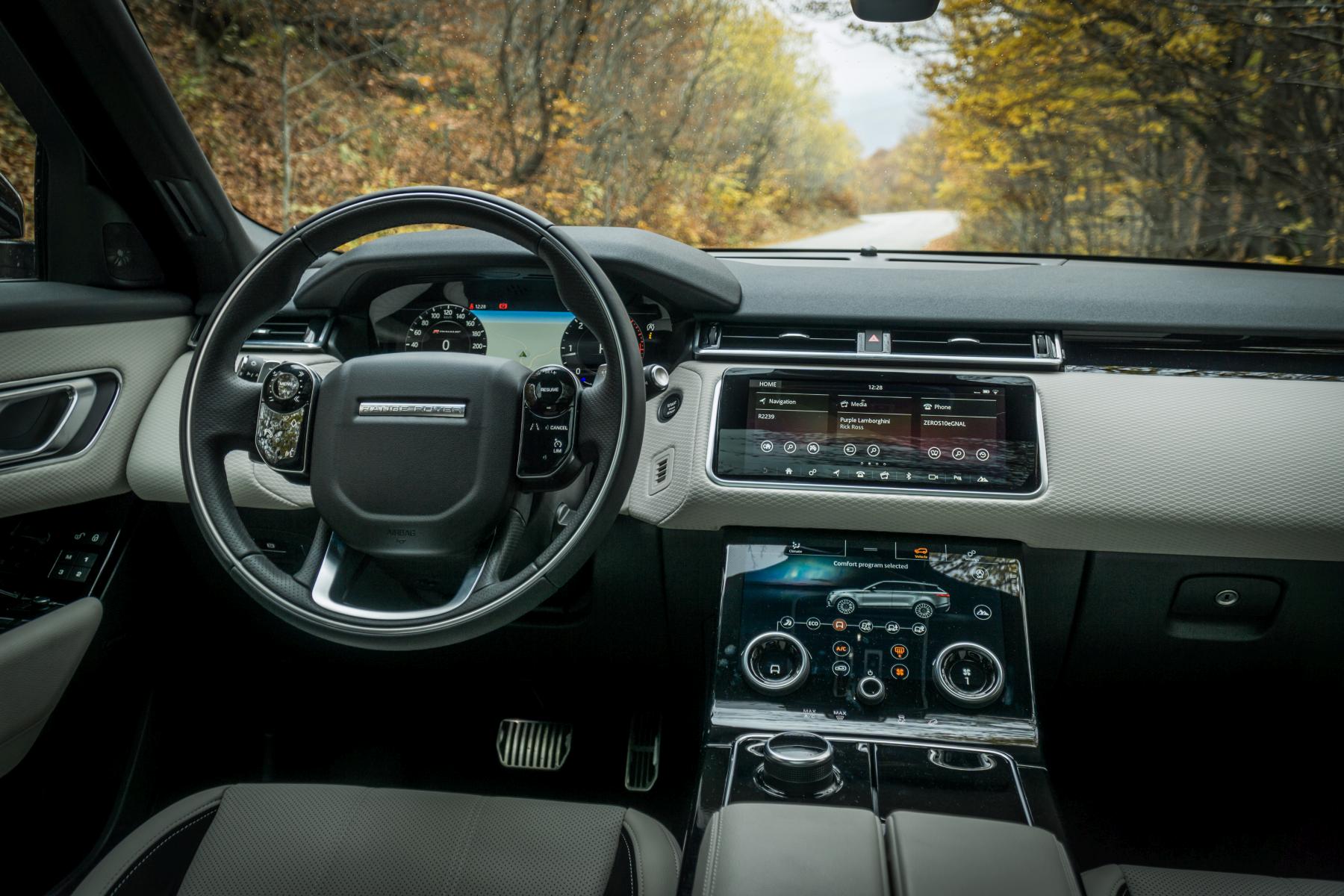 Одиме внатре. Кабината на Velar е едноставно… Прекрасна. Дизајнот е истовремено воздржан, но и современ. Нема непотребни линии, непотребни детали – сè што е поставено, е поставено онаму каде треба да биде. Главниот збор го имаат трите дигитални дисплеи – еден пред возачот и два на централната конзола. Пред возачот се поставени дигиталните инструменти со неколку различни прикази, додека дисплеите на централната конзола се наменети за мултимедијалниот уред и за климата и режимите на возење.
