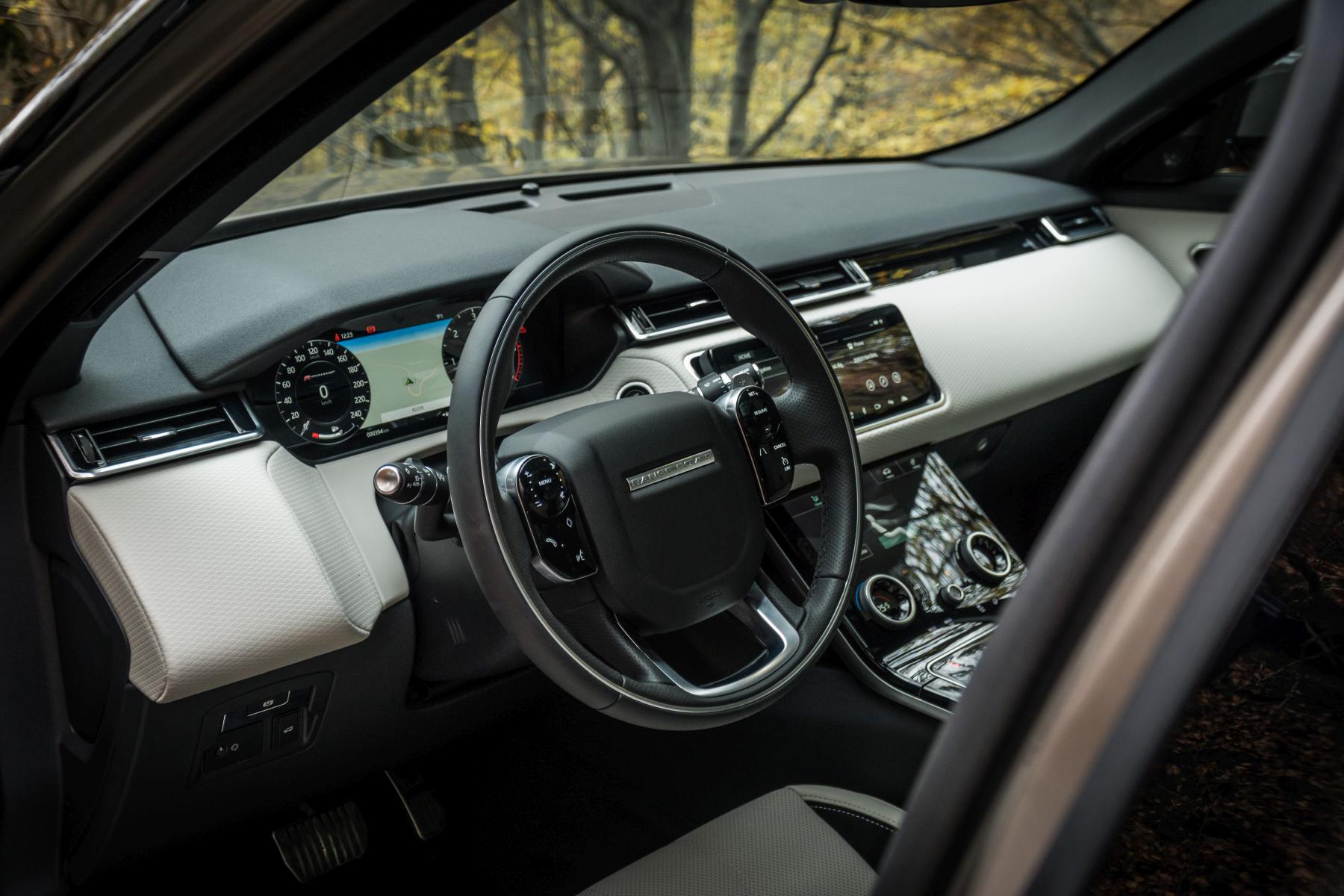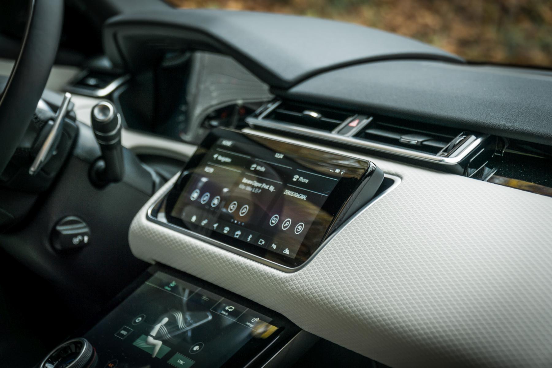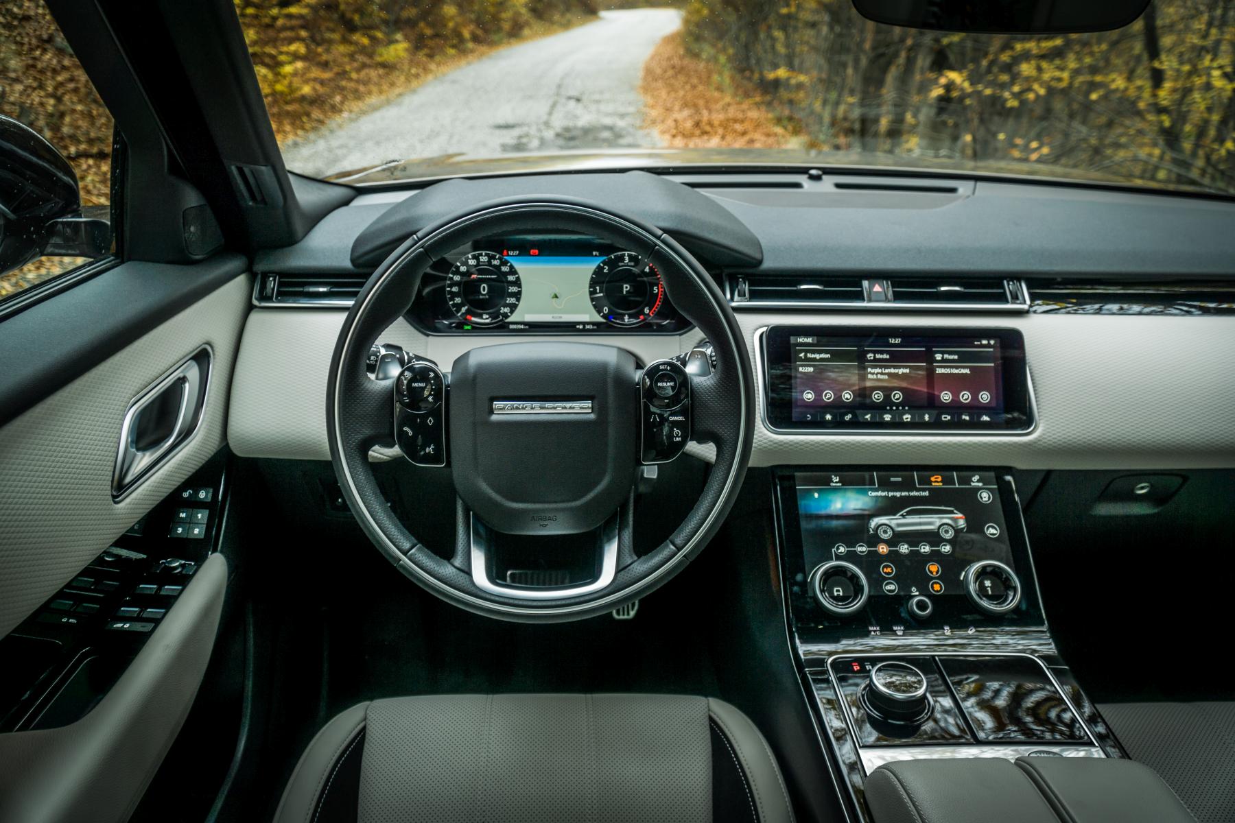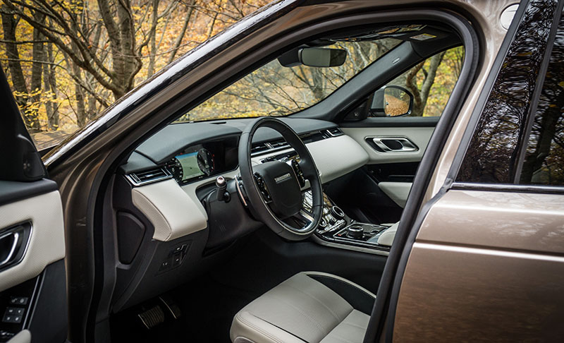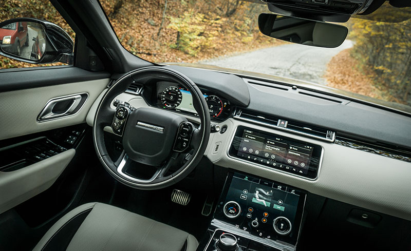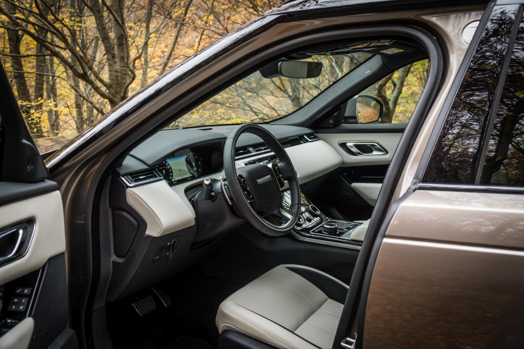 Одиме внатре. Кабината на Velar е едноставно… Прекрасна. Дизајнот е истовремено воздржан, но и современ. Нема непотребни линии, непотребни детали – сè што е поставено, е поставено онаму каде треба да биде. Главниот збор го имаат трите дигитални дисплеи – еден пред возачот и два на централната конзола. Пред возачот се поставени дигиталните инструменти со неколку различни прикази, додека дисплеите на централната конзола се наменети за мултимедијалниот уред и за климата и режимите на возење.