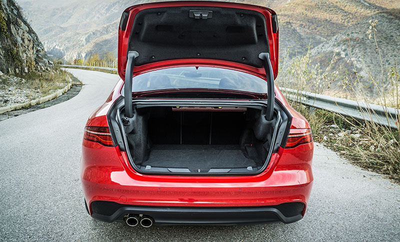 Сепак, вреди да се напомене дека тунелот за преносот кон задните тркала е прилично голем – па не би препорачале пренесување тројца патници на задната клупа – барем, не на подолги возења. Инаку, XE добива сосем респектабилен багажник – отворете го поклопецот на багажникот и ќе најдете 410 литри, достапни преку прилично правилен отвор. Секако, задните седишта се спуштаат за уште поголем простор, доколку сакате да пренесете нешто поголемо.