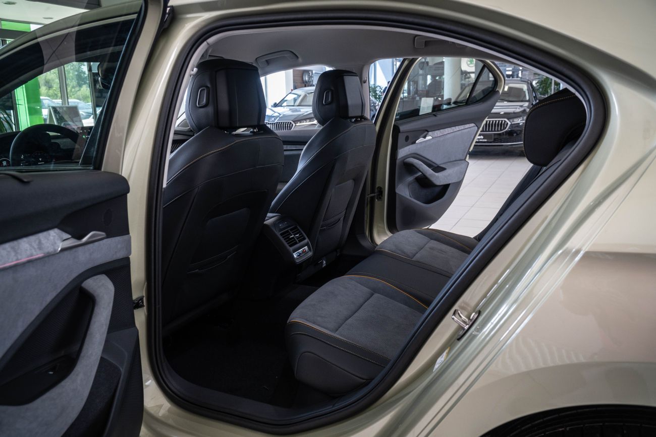 На задниот дел вниманието оди кон кристалните задни светла и името Skoda кое гордо стои на средината на петтата врата. Силуетата е нагласено-хоризонтална и навистина е убаво да се види дека седаните сè уште имаат свое место и свој достоен претставник.