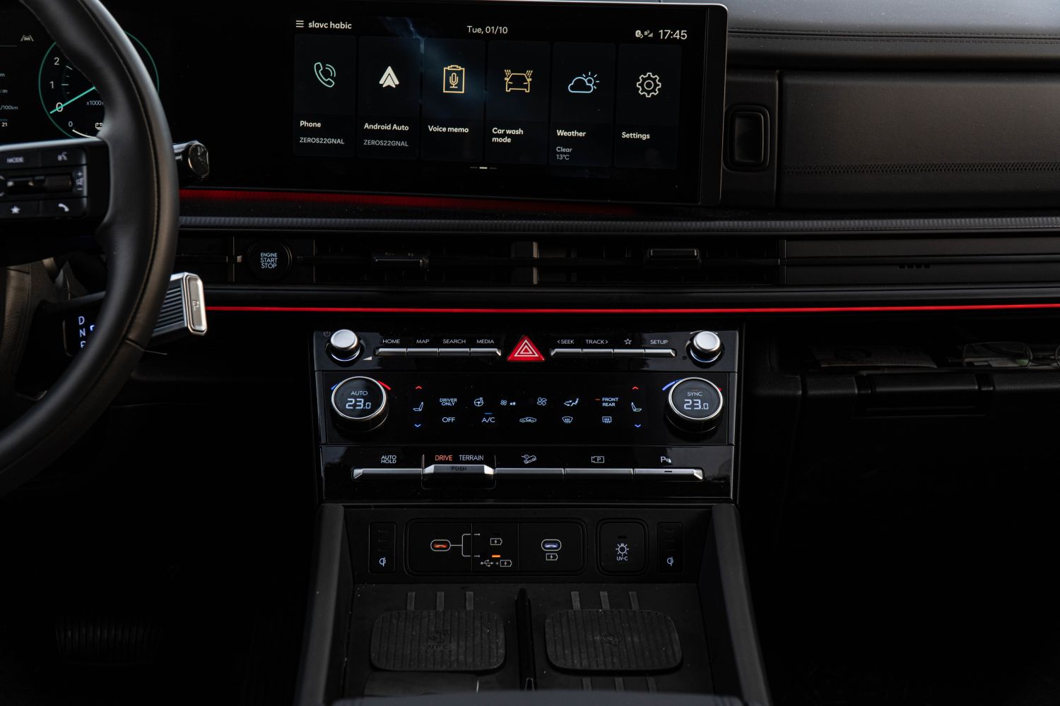 На горната половина на централната конзола е поставен дигиталниот хаб на Santa Fe. Тоа се всушност два екрани со дијагонала од 12.3 инчи – еден наменет за возачот и на него се поставени инструментите и информациите околу возењето, а друг наменет за навигацијата и мултимедијалните функционалности. Дополнително, има уште еден екран поставен во централната конзола преку кој се контролира клима уредот. Сепак, вреди да се напомене дека Hyundai одлучиле да задржат и физички контроли за многу од функционалностите. Под овој екран е подлогата за безжично полнење на два мобилни уреди.