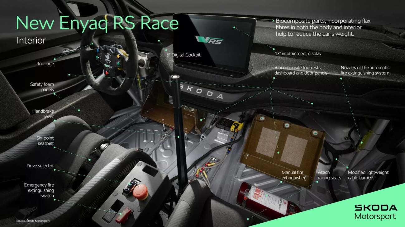 За да понуди тркачка управливост, Enyaq RS Race има оптимизирана шасија и прилагодлива спортска суспензија со уникатни пружини и амортизери. Тука се и хидрауличната рачна сопирачка како и предните и задните диференцијали со ограничено пролизгување.