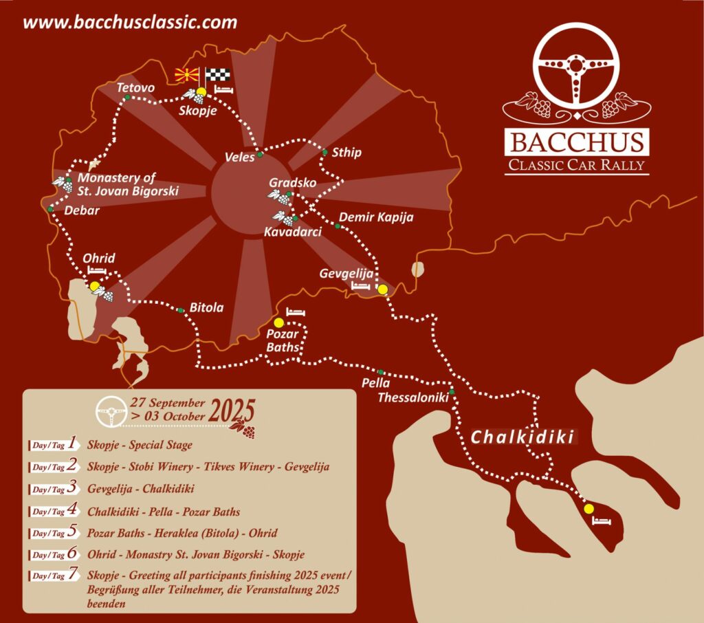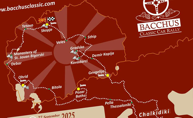 Инаугуративното издание на Bacchus Classic Car Rally ќе започне на 27-ми Септември во Скопје и плејада на ретки олдатјмери ќе патуваат од Скопје кон Грција, ќе посетат неколку места низ Македонија и повторно ќе завршат во Скопје.