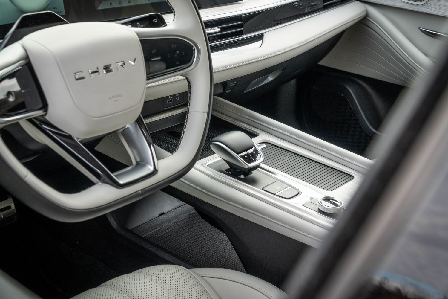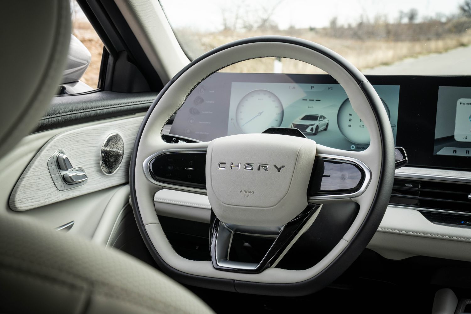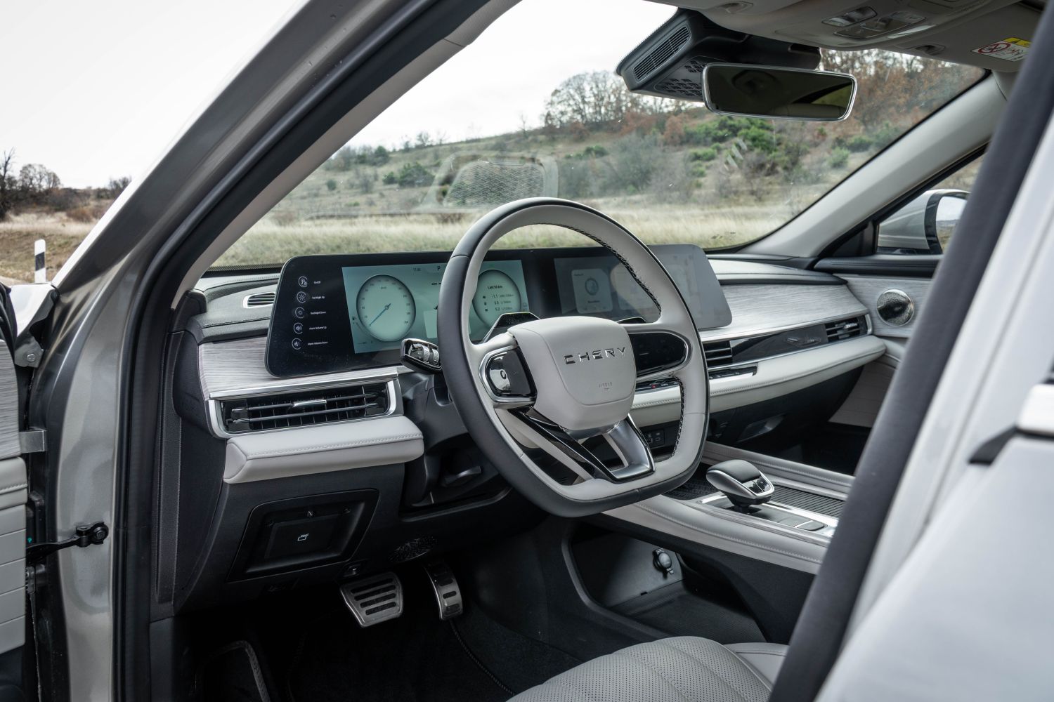 Ја отвораме вратата и нè пречекува светла, повикувачка кабина. Она кое веднаш се забележува е самоуверениот, премиум пристап на Chery. Се сместуваме во комфорните предни седишта (кои се обвиени во навистина мека имитација на кожа) и веднаш станува јасно дека кинескиот бренд со овој модел оди едно скалило нагоре. Да, седиштата се со загревање и вентилација. Нормално дека се. Имаме само една мала забелешка – би сакале да можеа возачкото и совозачкото седиште да одат уште неколку сантиметри надоле.