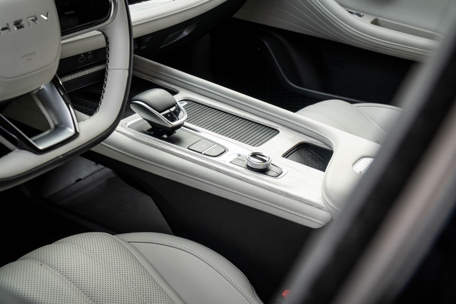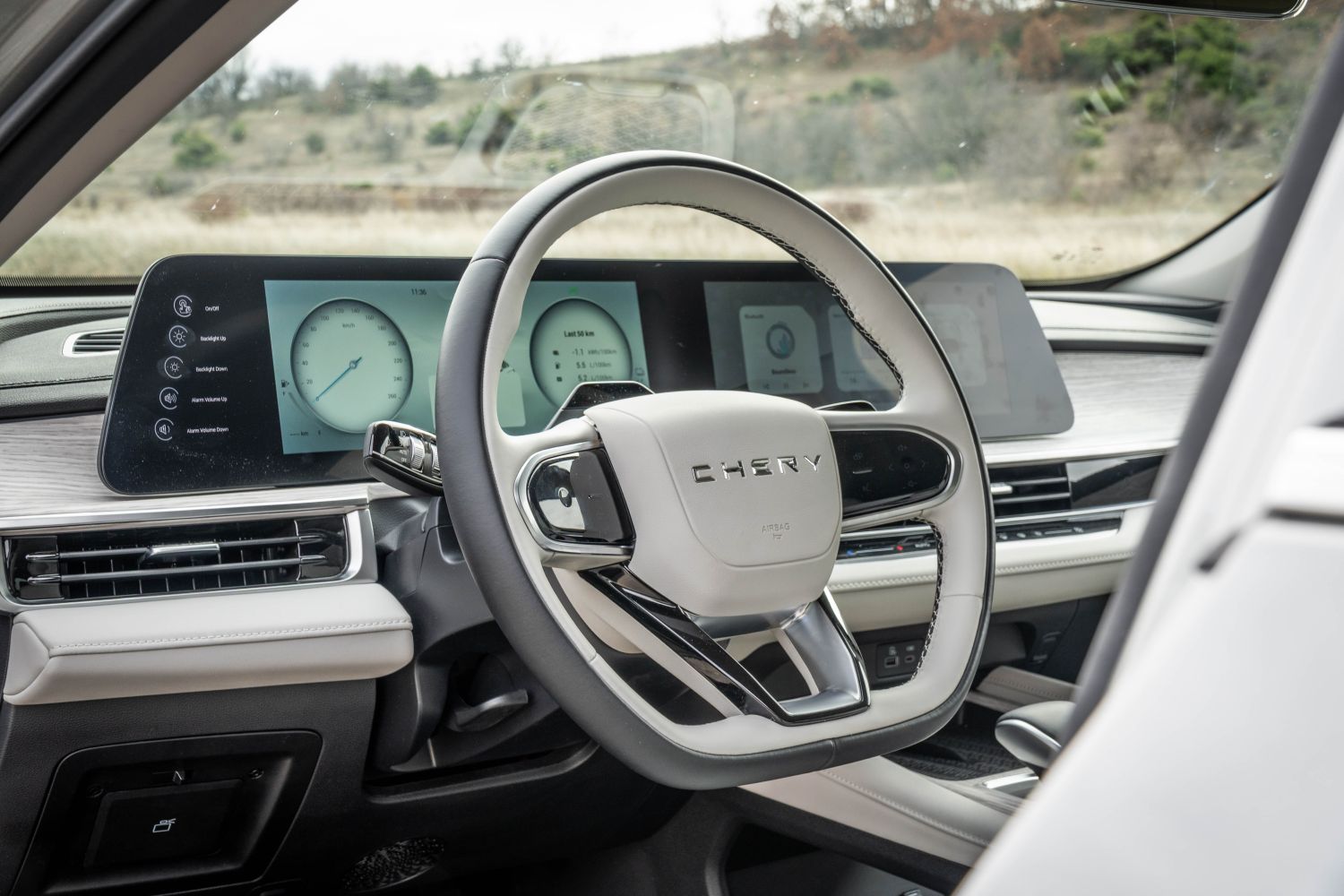 Ја отвораме вратата и нè пречекува светла, повикувачка кабина. Она кое веднаш се забележува е самоуверениот, премиум пристап на Chery. Се сместуваме во комфорните предни седишта (кои се обвиени во навистина мека имитација на кожа) и веднаш станува јасно дека кинескиот бренд со овој модел оди едно скалило нагоре. Да, седиштата се со загревање и вентилација. Нормално дека се. Имаме само една мала забелешка – би сакале да можеа возачкото и совозачкото седиште да одат уште неколку сантиметри надоле.