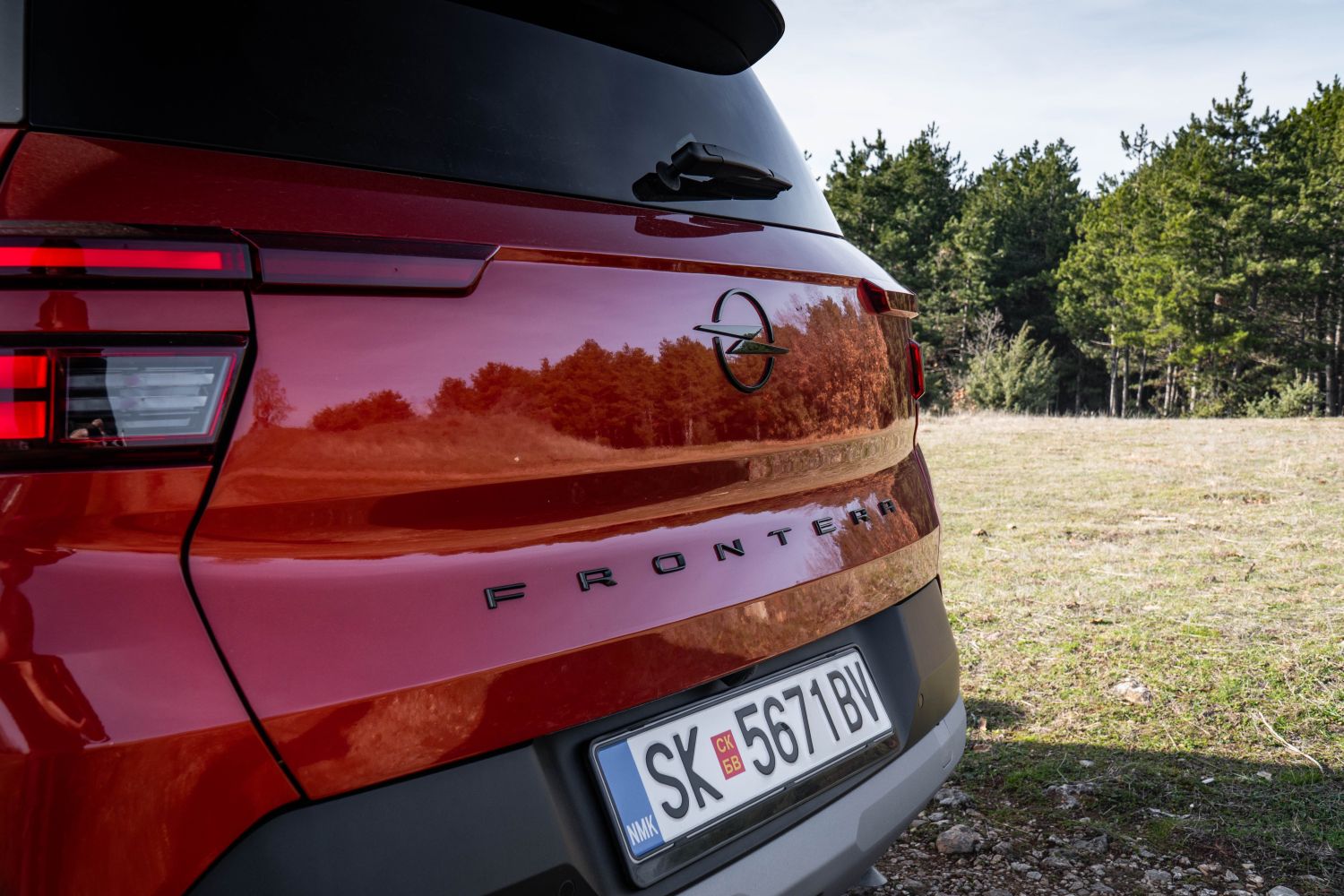 На прв контакт, забележуваме дека дизајнот на Frontera е чист и безвременски. Океј, ова не е дизајн кој ќе ви ја зоврие крвта во жилите, но токму ваквиот пристап резултира со автомобил кој ќе изгледа подеднакво свежо и за неколку години од сега. На предниот дел главниот збор го имаат Vizor маската на Opel и длабокиот преден браник. Интересен модерен детал кој ни се допаѓа е Opel Blitz знакот кој е во црна боја и е интегриран во Vizor маската.